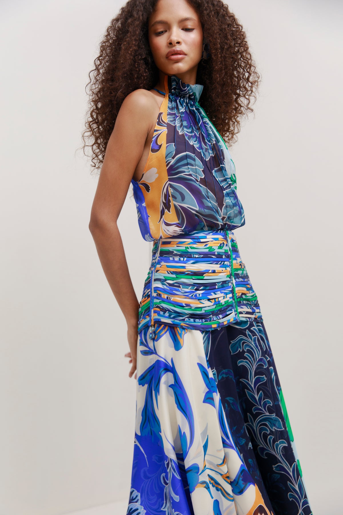 Our Garden Top is a halter-neck design in printed silk chiffon, featuring soft draping. Its fluid silhouette and bold pattern make it a standout statement piece for day or night.