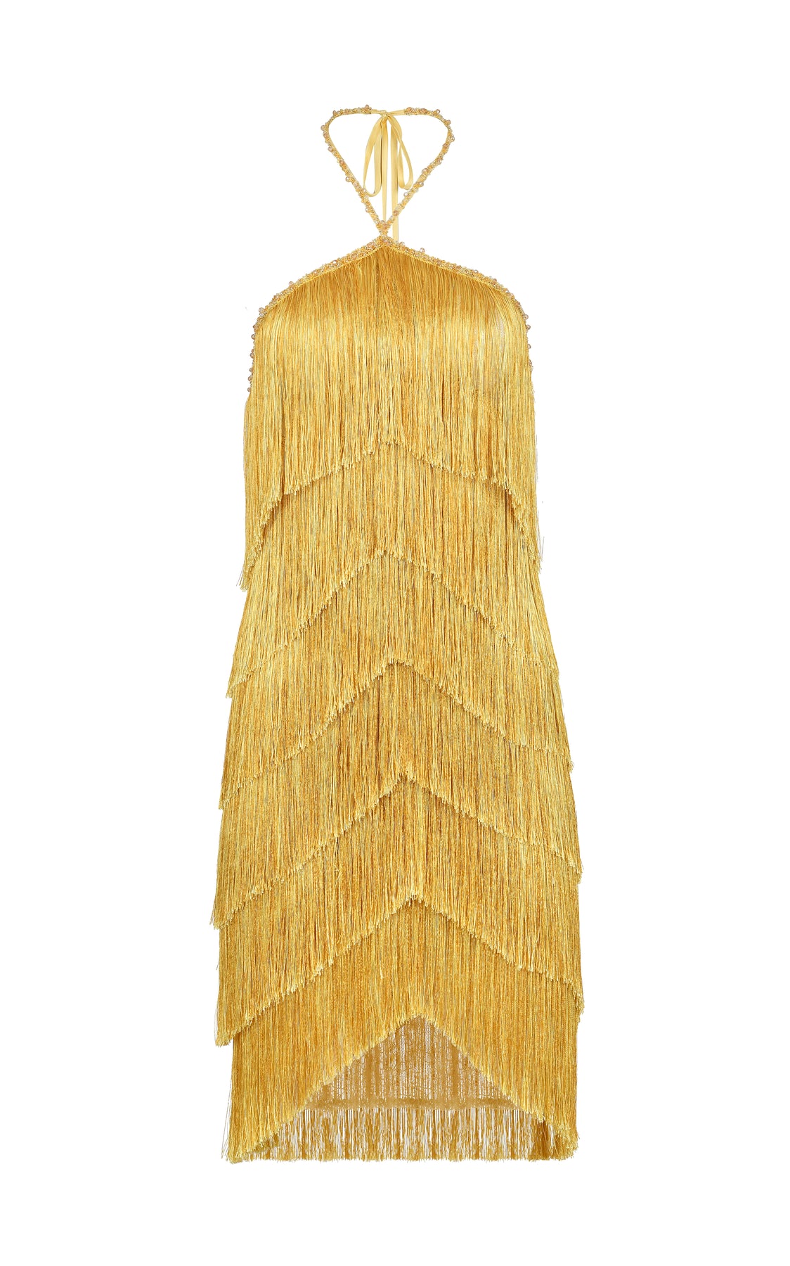 Our Estrella Sun Dress is a halter neck mini defined by cascading fringe layers and soft movement, finished with subtle shimmer that catches the light.