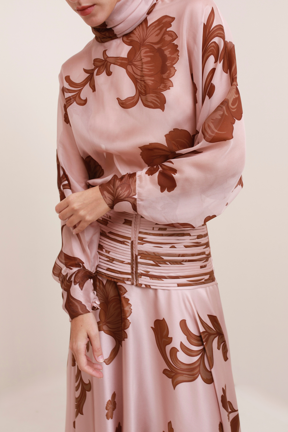 Sheer and lightweight in printed silk chiffon, the Garden Blouse features a high neckline and relaxed silhouette. Pink tones and bold brown florals create a refined balance of softness and statement.