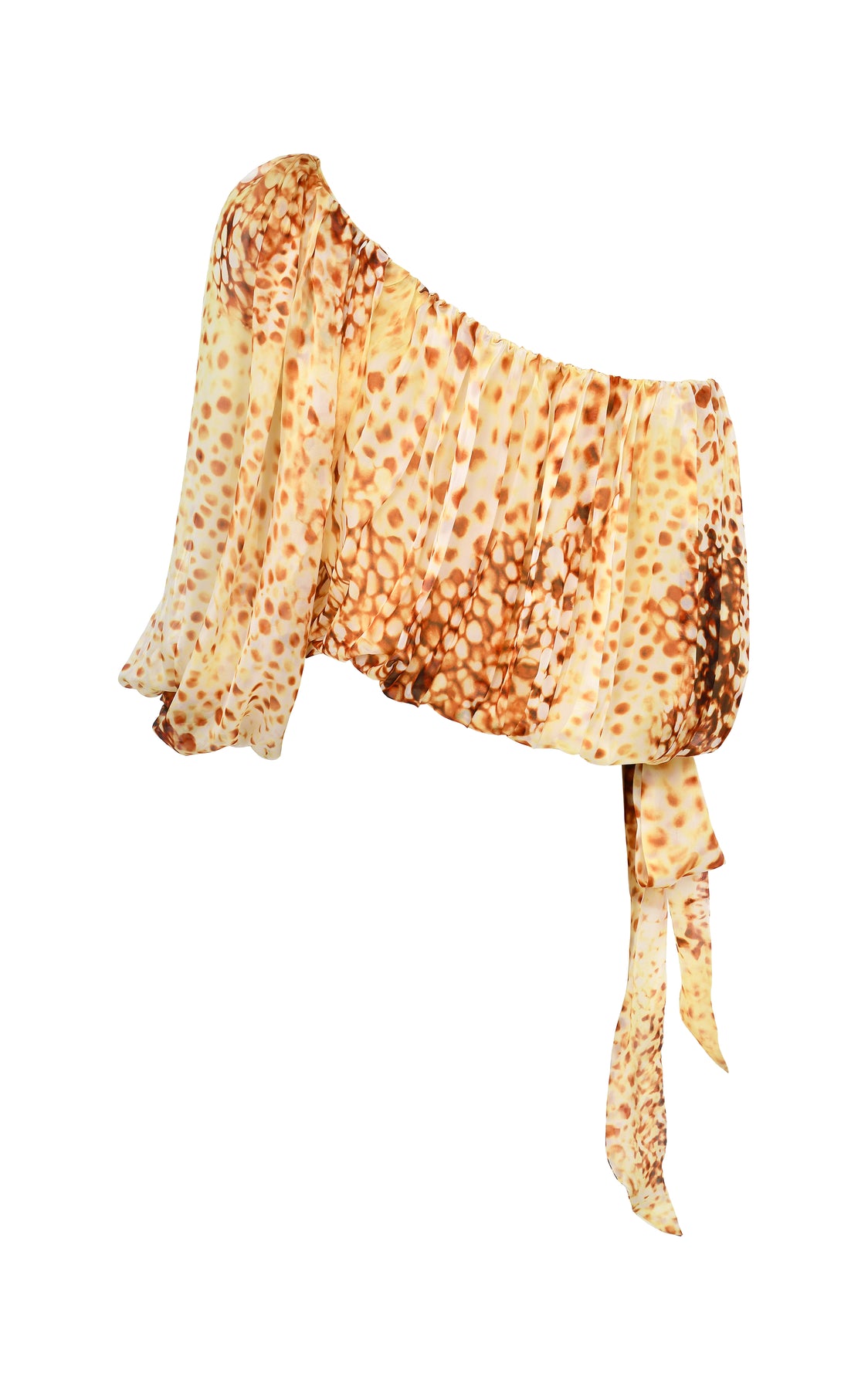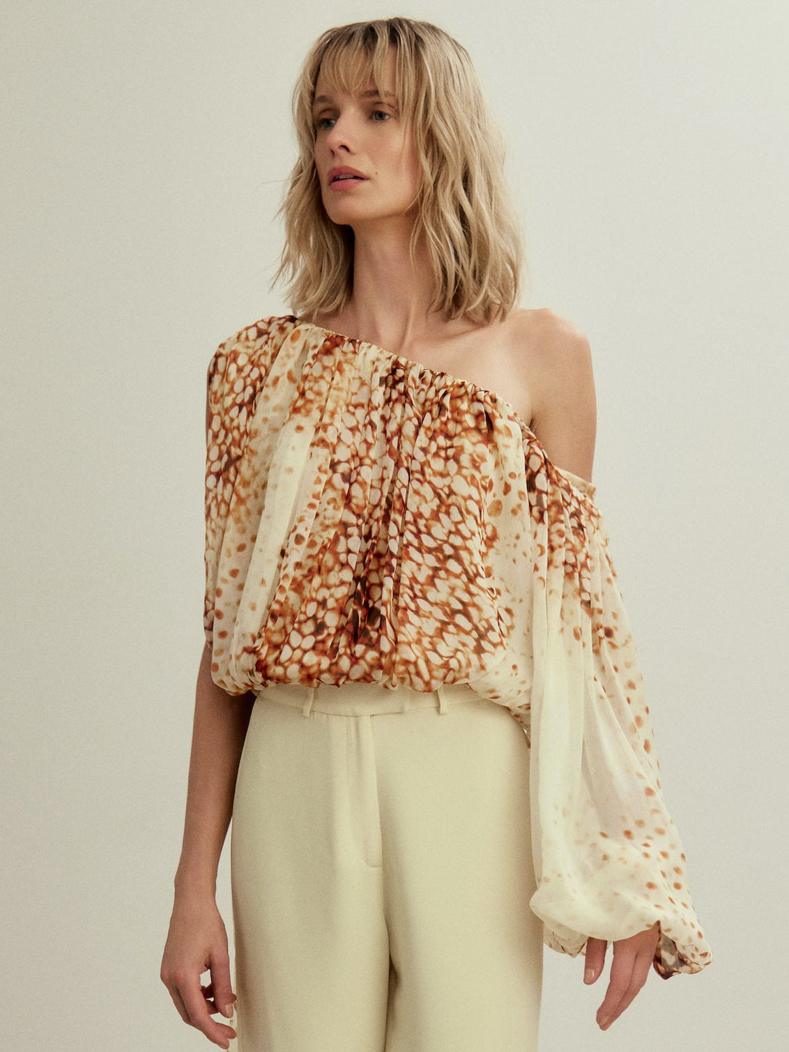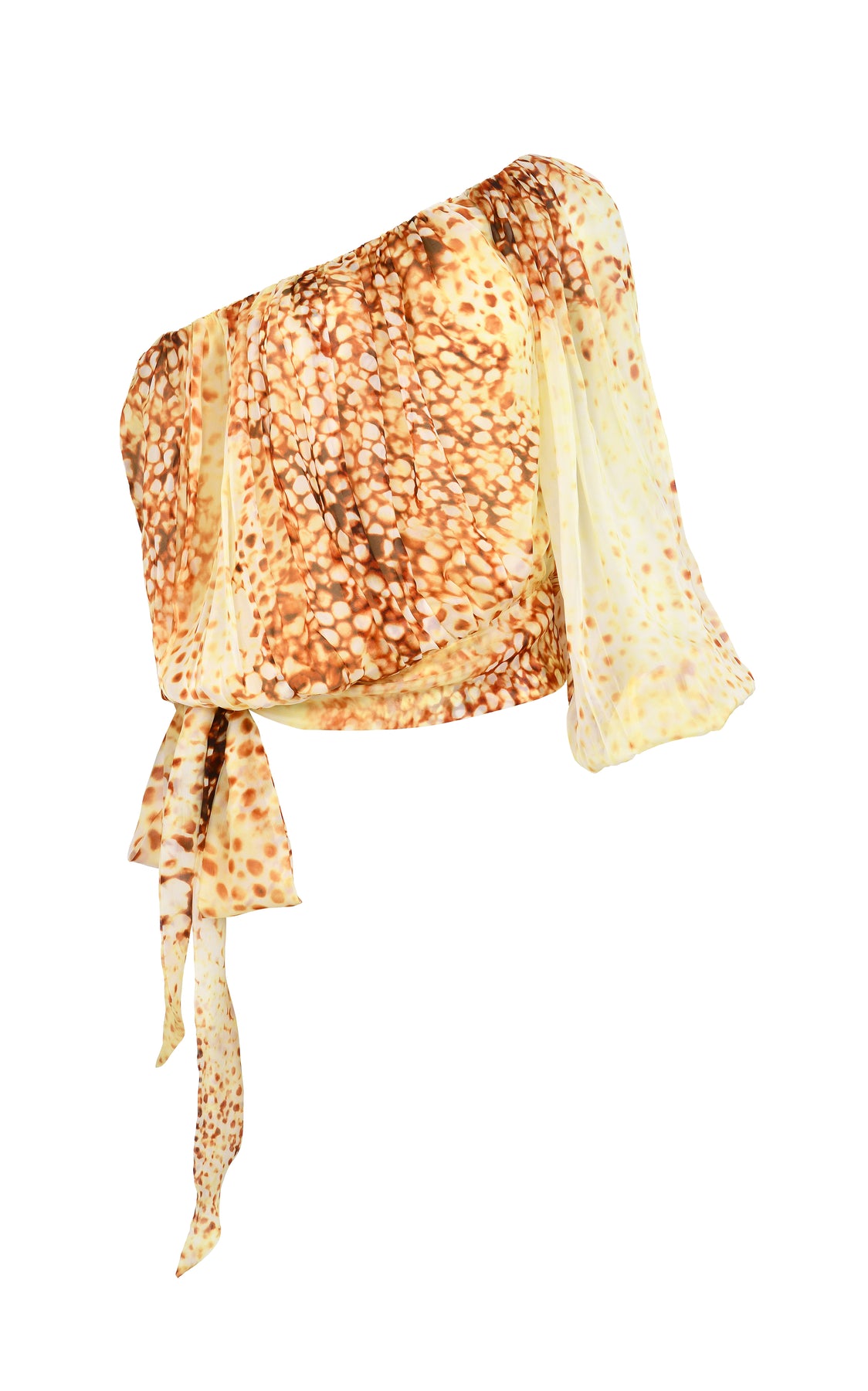 The Aire Yellow Blouse features an off-the-shoulder neckline with soft gathers that create volume and movement. Airy and fluid, it drapes effortlessly over the body, offering a relaxed yet refined silhouette with an expressive feel.